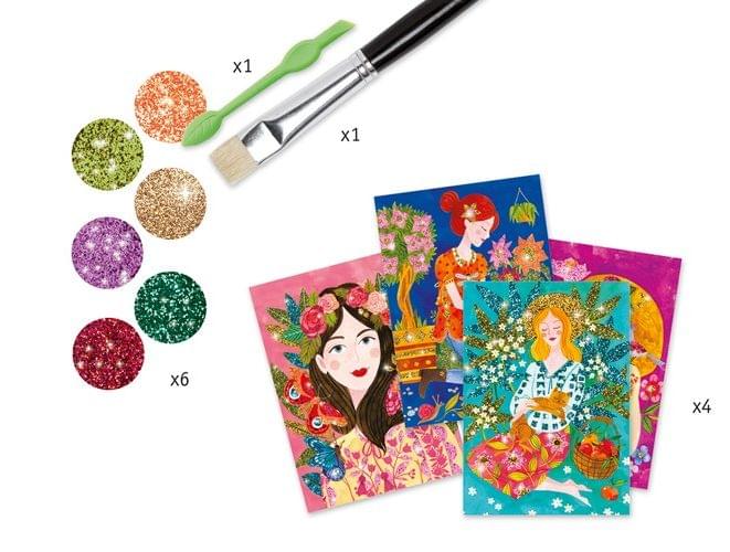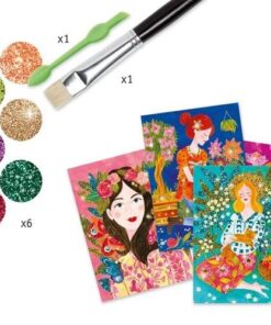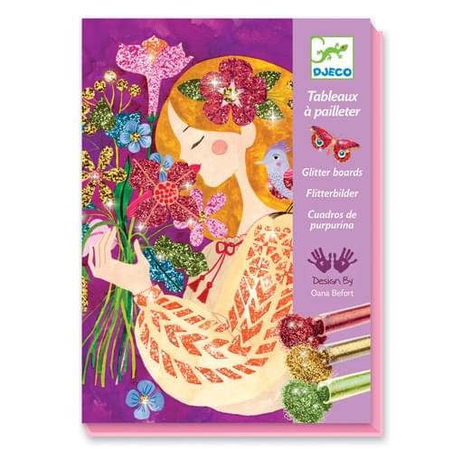 Εικαστική κατασκευή της εταιρίας Djeco. Περιλαμβάνει 4 καρτέλες, 6 σωληνάρια χρυσόσκονης και 1 βιβλιαράκι με εικονογραφημένες οδηγίες. Οι καρτέλες διαθέτουν αυτοκόλλητο, πάνω στο οποίο οι μικρές μας φίλες μπορούν να κολλήσουν την χρυσόσκονη. Διακοσμήστε το δωμάτιο σας με πανέμορφα λουλούδια που λάμπουν και εντυπωσιάστε τις φίλες σας.