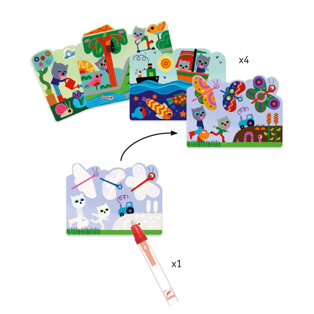 Σετ ζωγραφικής με μαγικά χρώματα! Αποτελείται από τέσσερις καρτέλες με ζωάκια κρυμμένα στον κήπο! Τα παιδιά γεμίζουν τον μαρκαδόρο με νερό κι έπειτα ξεκινούν να χρωματίζουν για να αποκαλύψουν κάθε είδους εκπλήξεις. Όταν ο μαρκαδόρος στεγνώσει τον γεμίζουμε ξανά και ακλουθούμε την ίδια διαδικασία.