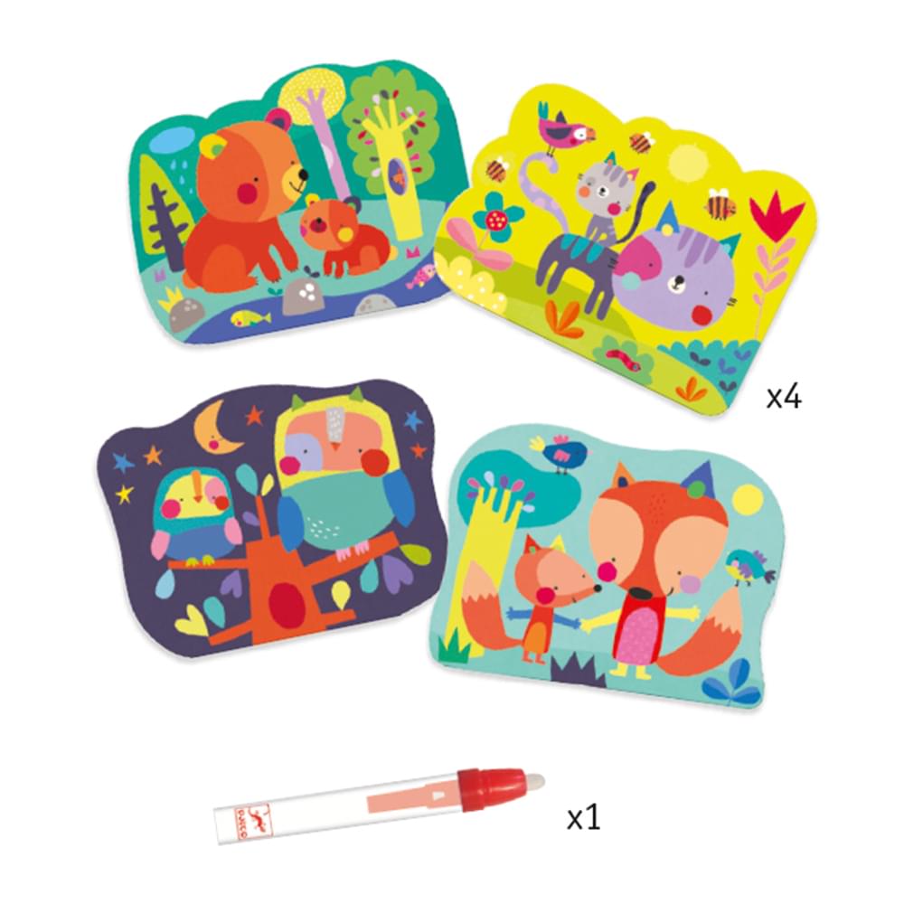 Σετ ζωγραφικής με μαγικά χρώματα! Αποτελείται από τέσσερις καρτέλες με ζωάκια κρυμμένα στο δάσος! Τα παιδιά γεμίζουν τον μαρκαδόρο με νερό κι έπειτα ξεκινούν να χρωματίζουν για να αποκαλύψουν κάθε είδους εκπλήξεις. Όταν ο μαρκαδόρος στεγνώσει τον γεμίζουμε ξανά και ακλουθούμε την ίδια διαδικασία.