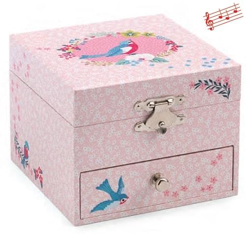 Μουσική μπιζουτιέρα από την εταιρεία Djeco. Διακοσμήστε το δωμάτιο σας με την πανέμορφη μπιζουτιέρα και φυλάξτε τα αγαπημένα σας κοσμήματα! Κουρδίστε την και το μικρό πουλάκι θα αρχίσει να χορεύει με την μελωδία ‘Le temps des cerises – Renard’! Διαθέτει συρτάρι αποθήκευσης.