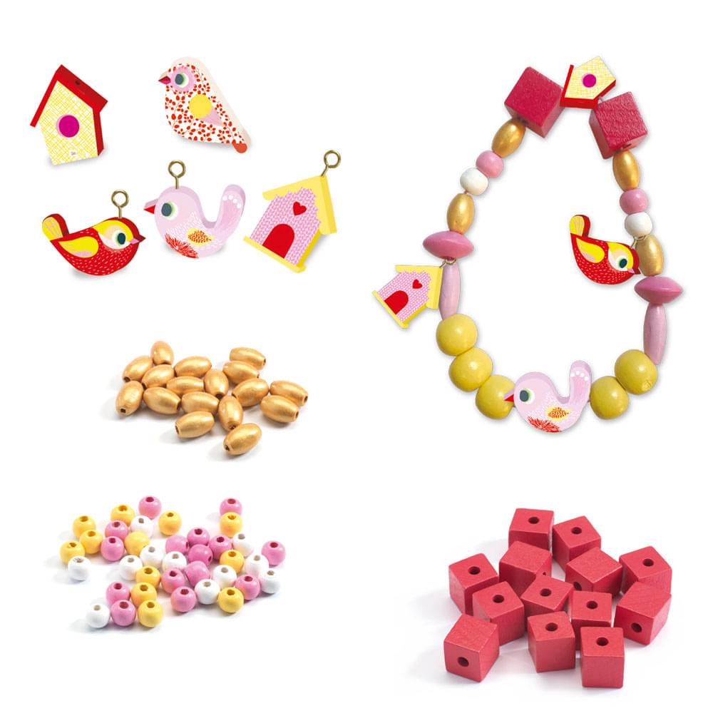 Χρησιμοποιήστε αυτό το όμορφο σύνολο από ξύλινες χάντρες της εταιρείας Djeco για να δημιουργήσετε υπέροχα κοσμήματα! Το σετ περιλαμβάνει μικρά, αγαπημένα πουλάκια καθώς και χάντρες σε παστέλ ροζ, φουξ και χρυσαφί χρώμα για να κάνετε υπέροχα βραχιόλια και περιδέραια! Περιλαμβάνονται: 450 ξύλινες χάντρες και 6 μέτρα κορδόνι.