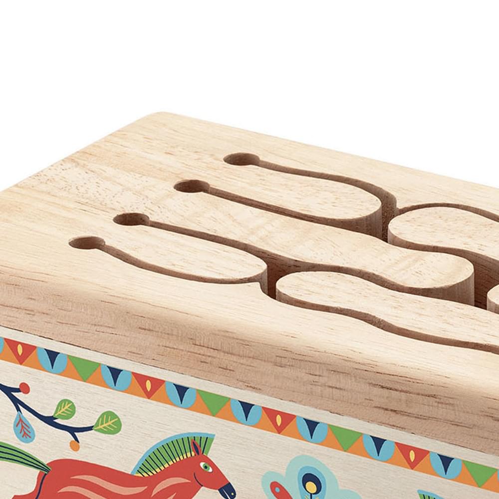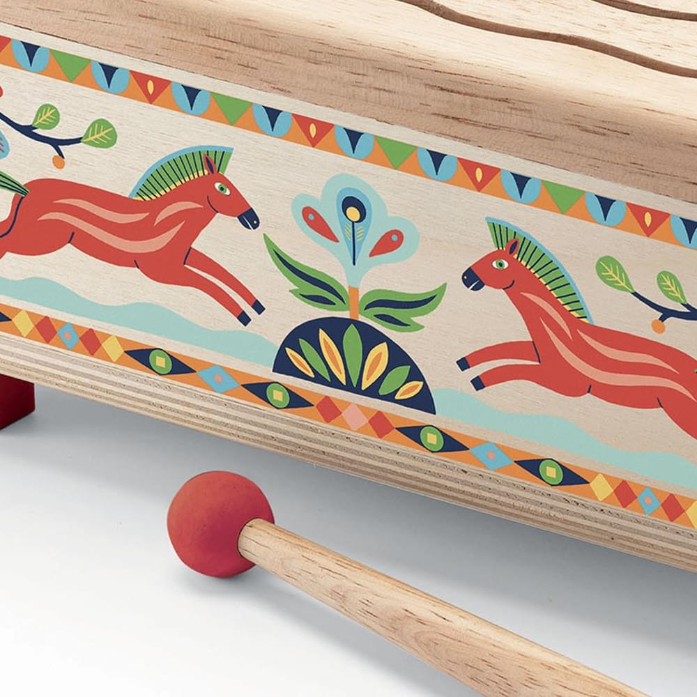 Ξύλινο κρουστό ταμπούρλο από την εταιρεία Djeco σε ορθογώνιο παραλληλόγραμμο σχήμα και υπέροχη εικονογράφιση. Ένα μουσικό παιχνίδι όμορφα σχεδιασμένο για να εξασκεί την ακουστική ικανότητα του παιδιού και την μυϊκή δύναμη των χεριών του. Συνοδεύεται από ξύλινη μπαγκέτα που καταλήγει σε καουτσούκ για να γλυκαίνει ο ήχος.