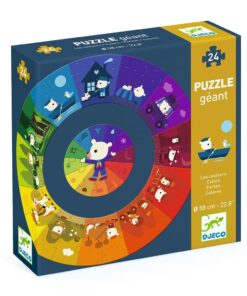 Ανακαλύψτε το παζλ γίγας της εταιρείας Djeco. Ένα παζλ 24 κομματιών σε πρωτότυπο σχήμα από πεπιεσμένο χαρτί, που αντιπροσωπεύει έναν τροχό χρωμάτων. Μάθετε τα χρώματα του ουράνιου τόξου: το κόκκινο, το πορτοκαλί, το κίτρινο, το πράσινο, το μπλε και το μωβ. Ολοκληρώνοντας αυτό το υπέροχο παζλ, το παιδί συμμετέχει στις περιπέτειες της φιλικής λευκής αρκούδας στο δάσος, στο βουνό και την εξοχή. Ένα εκπαιδευτικό παζλ σχετικό με τον χρωματικό κύκλο. Μια υπέροχη, διασκεδαστική και εκπαιδευτική πρόταση δώρου.
