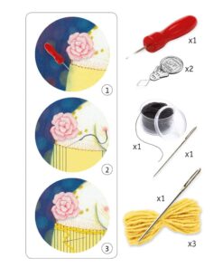 Περιέχει μια εικόνα για κατασκευή, 3 κουβαράκια από χρωματιστό μαλλί, 2 βοηθητικά σπειρώματα, 2 βελόνες κεντήματος, προστατευτικό δακτύλιο, και οδηγίες.