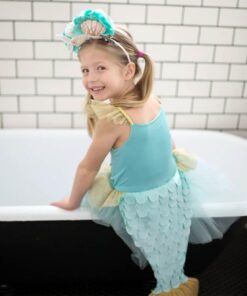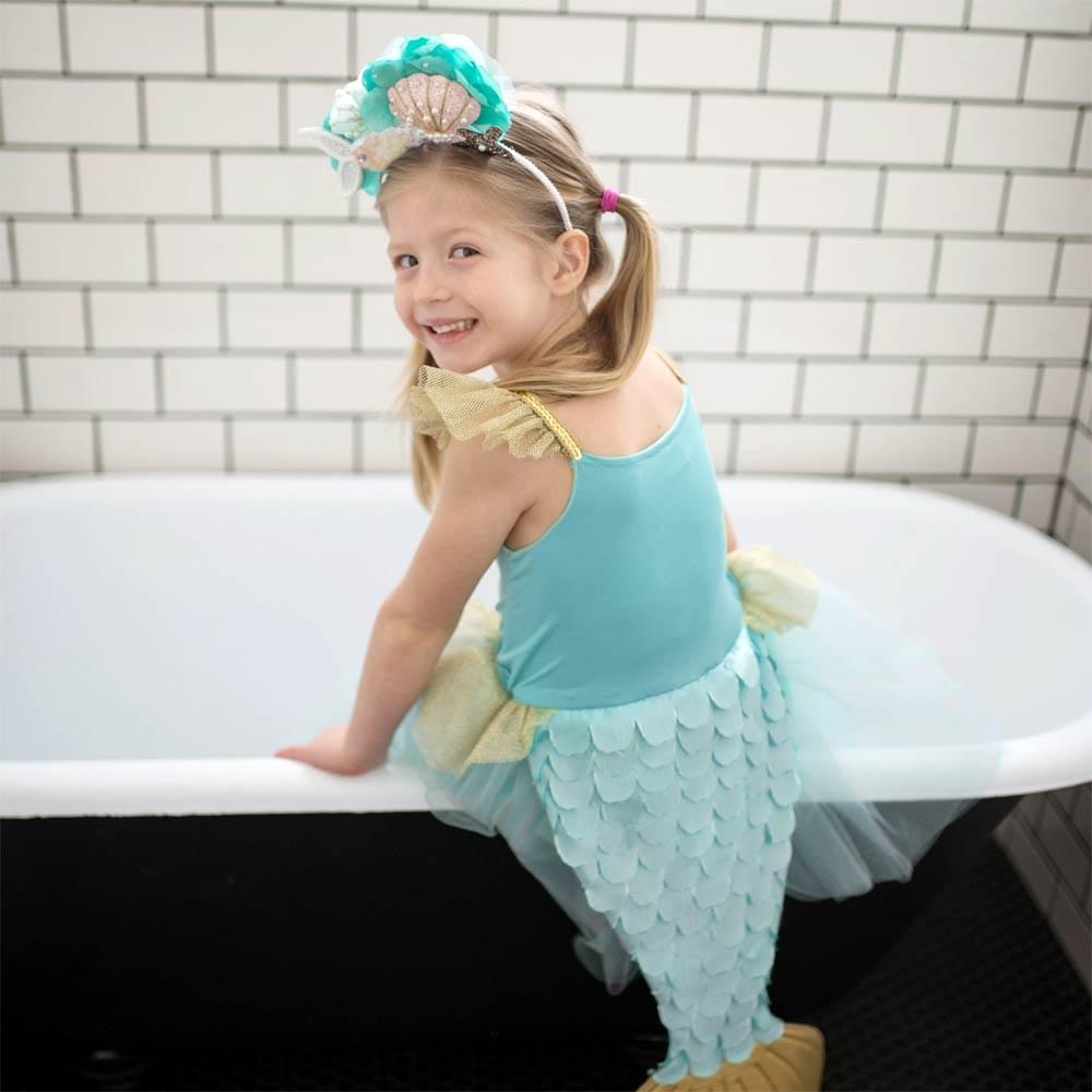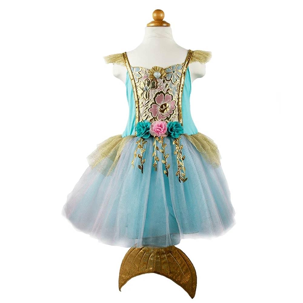 Στολή γοργόνας από την εταιρεία Great Pretenders. Αποτελείται από ένα γαλάζιο φόρεμα με χρυσές λεπτομέρειες και λουλούδια και στο πίσω μέρος κρέμεται μία ουρά γοργόνας για ατελείωτες ώρες παιχνιδιού.
