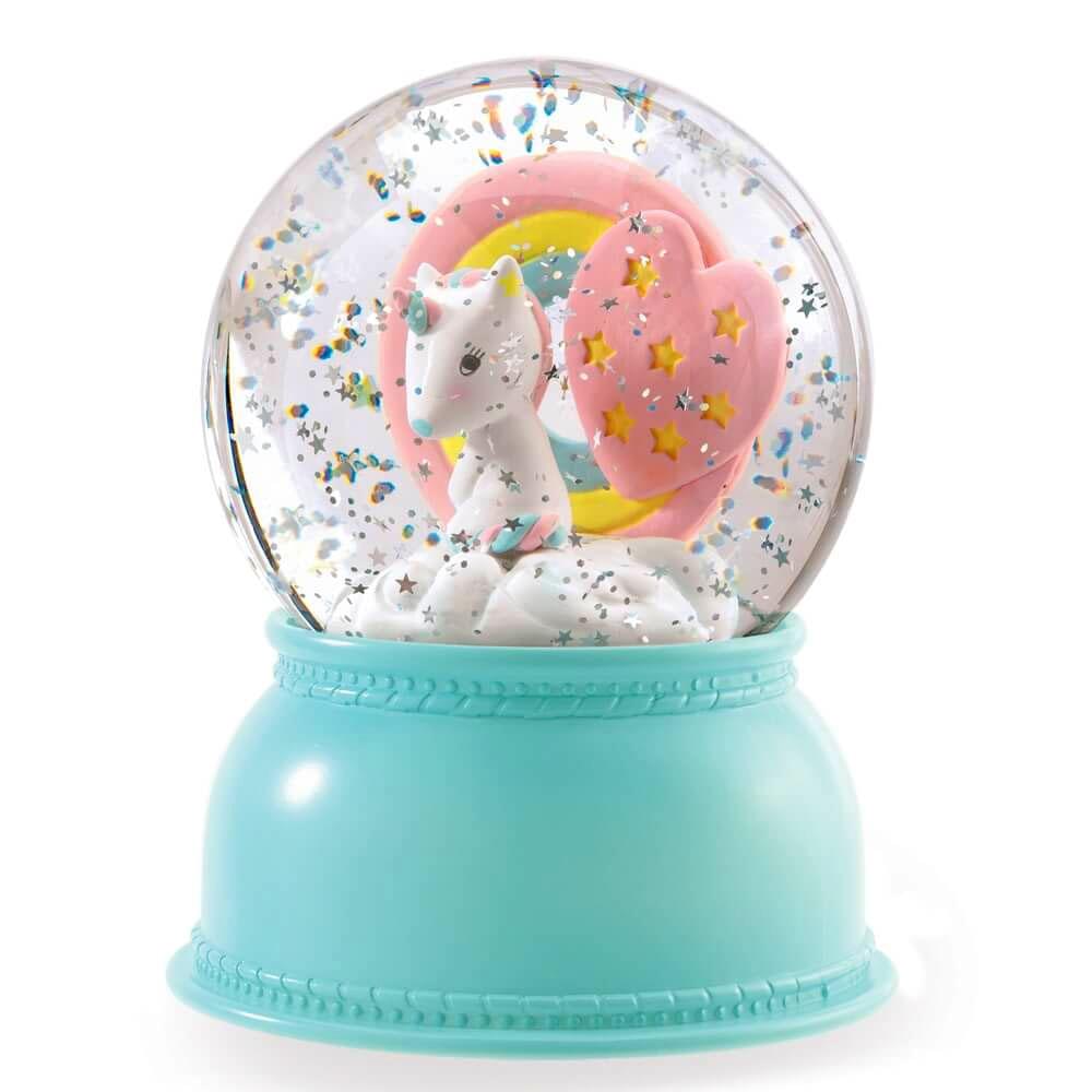 Η εταιρεία Djeco δημιούργησε για εσάς το ονειρεμένο φωτιστικό χιονόμπαλα! Ο μονόκερος χαρίζει στις μικρές μας πριγκίπισσες μια όμορφη διακόσμηση στο δωμάτιο τους και στιγμές χαλάρωσης για τον βραδινό ύπνο με τον ελαφρύ φωτισμό της. Δε χρειάζεται να την κουνήσετε, καθώς ο μηχανισμός που διαθέτει στροβιλίζει τις αστραφτερές νιφάδες!