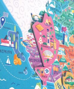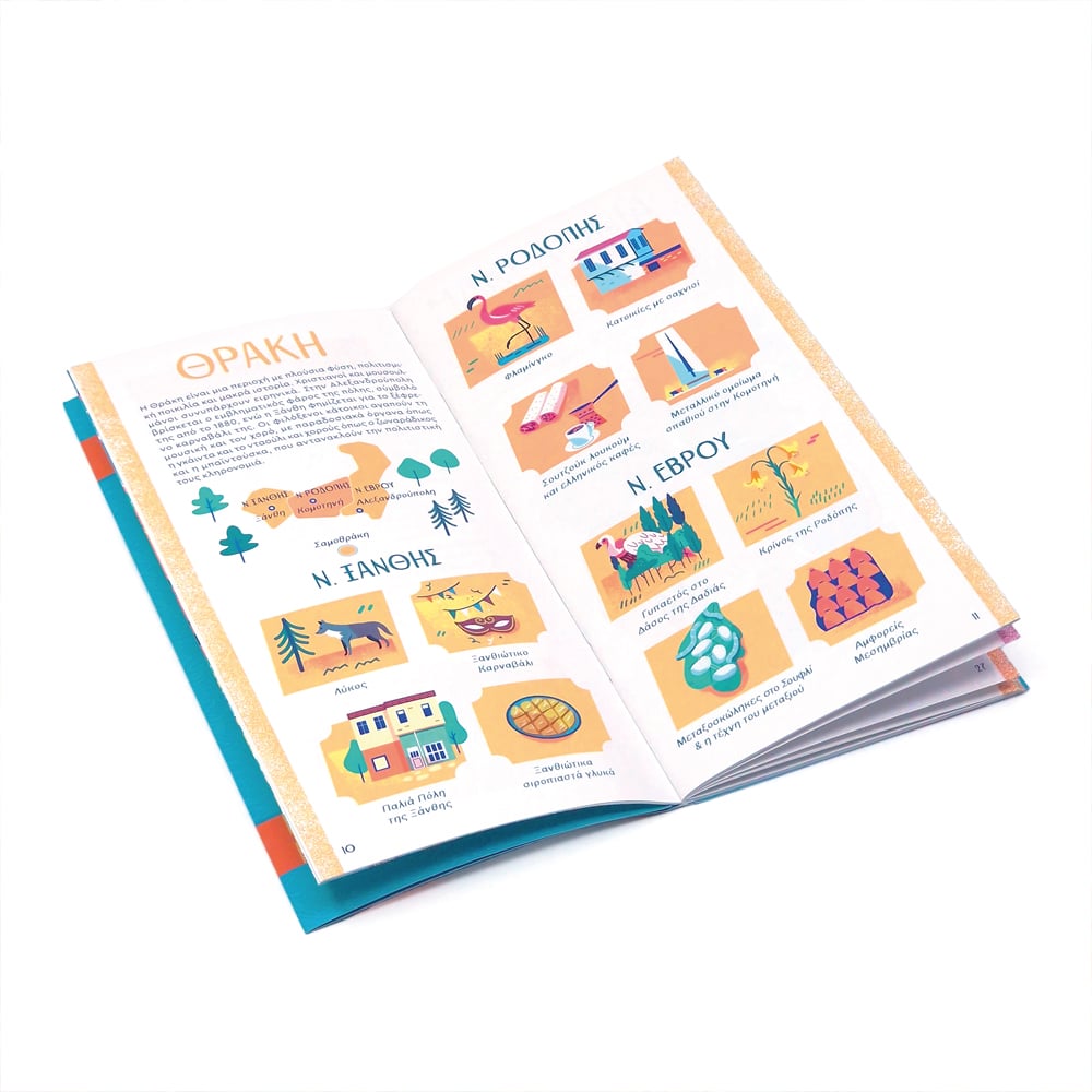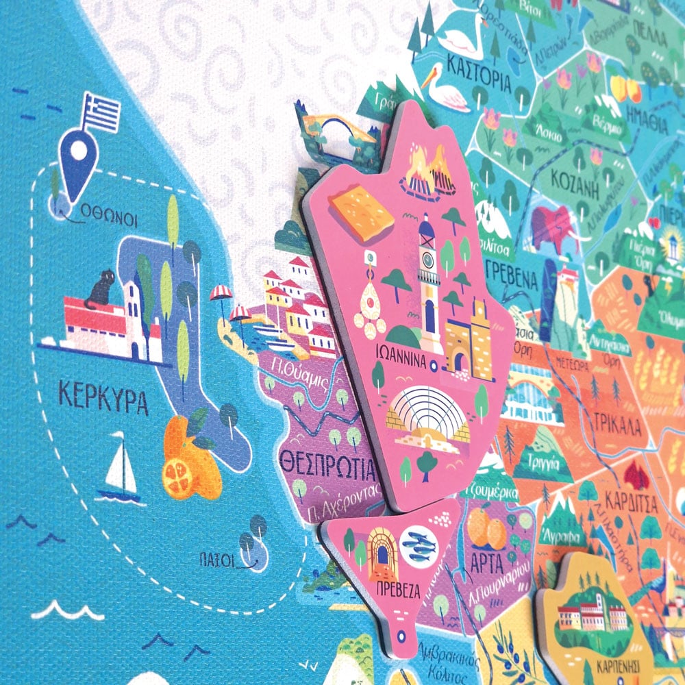 Με μια εντυπωσιακή εικονογράφηση γεμάτη γεωμορφολογικά στοιχεία – βουνά, ποτάμια, λίμνες – και μαγνητάκια που αναδεικνύουν τοπικά προϊόντα, αξιοθέατα και έθιμα, σας προσκαλεί να γνωρίσετε τη μοναδική γεωγραφία και πολιτιστική κληρονομιά της χώρας μας.