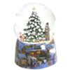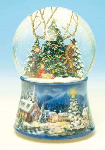 Xιονόμπαλα με μια οικογένεια με δώρα σε γυμνά και καταπράσινα δέντρα. Η βάση απεικονίζει ένα εντυπωσιακό καταπράσινο τοπίο. Φτιαγμένη από ρητίνη(επεξεργασμένη πορσελάνη).
