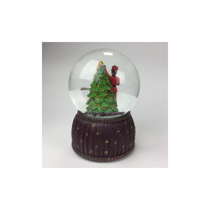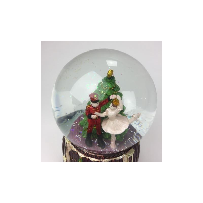 Xιονόμπαλα καρυοθραύστης και μπαλαρίνα χορεύουν μπροστά στο χριστουγεννιάτικο δέντρο. Περιστρέφεται γύρω από τον εαυτό της. Ανάγλυφη βάση με μοτίβο καρυοθραύστη μπαλαρίνα.Φτιαγμένη από ρητίνη(επεξεργασμένη πορσελάνη).