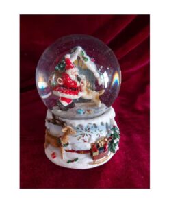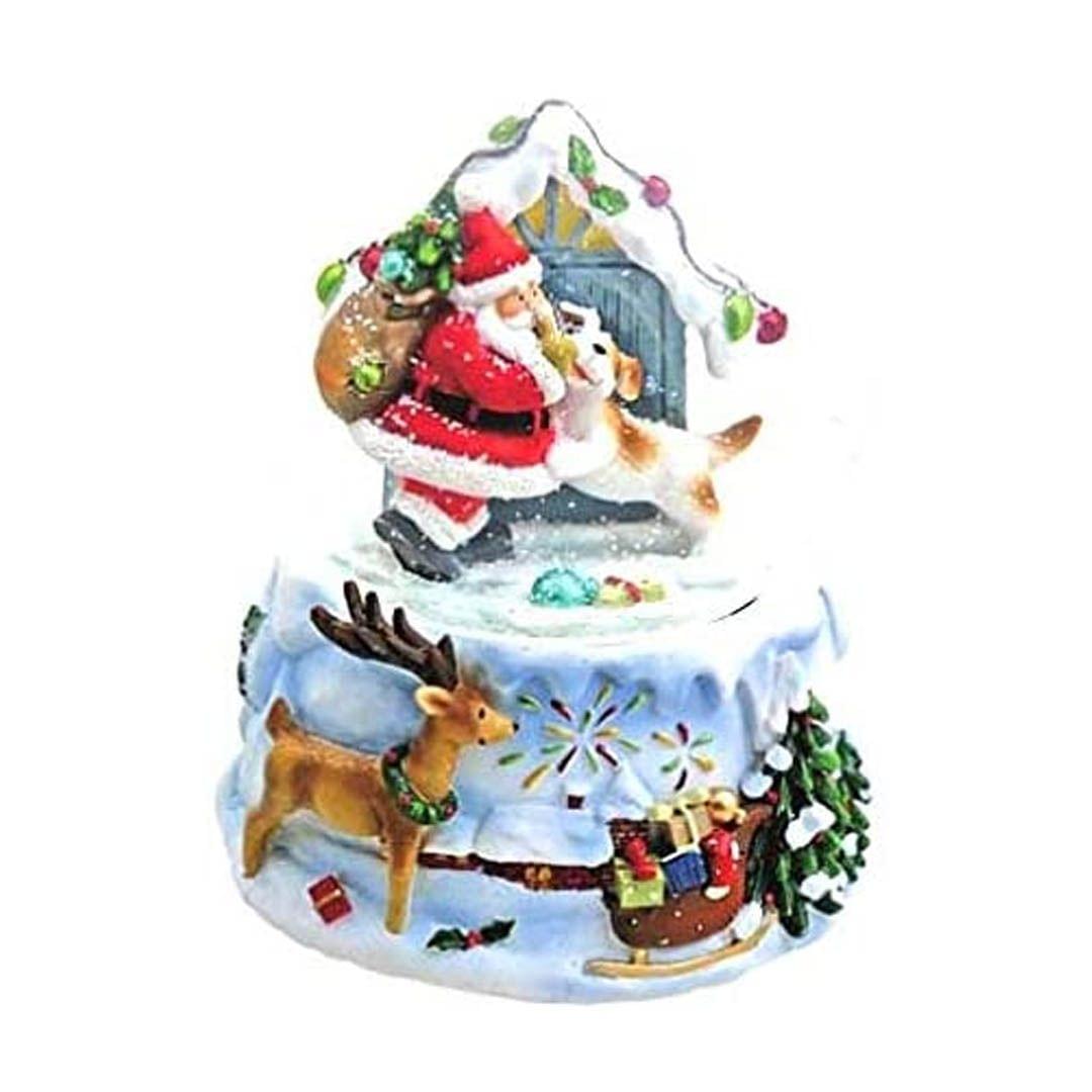 Μουσική χιονόμπαλα με τον Άγιο Βασίλη, τον σάκο και το σκύλο του έξω από την πόρτα ενός χιονισμένου σπιτιού.