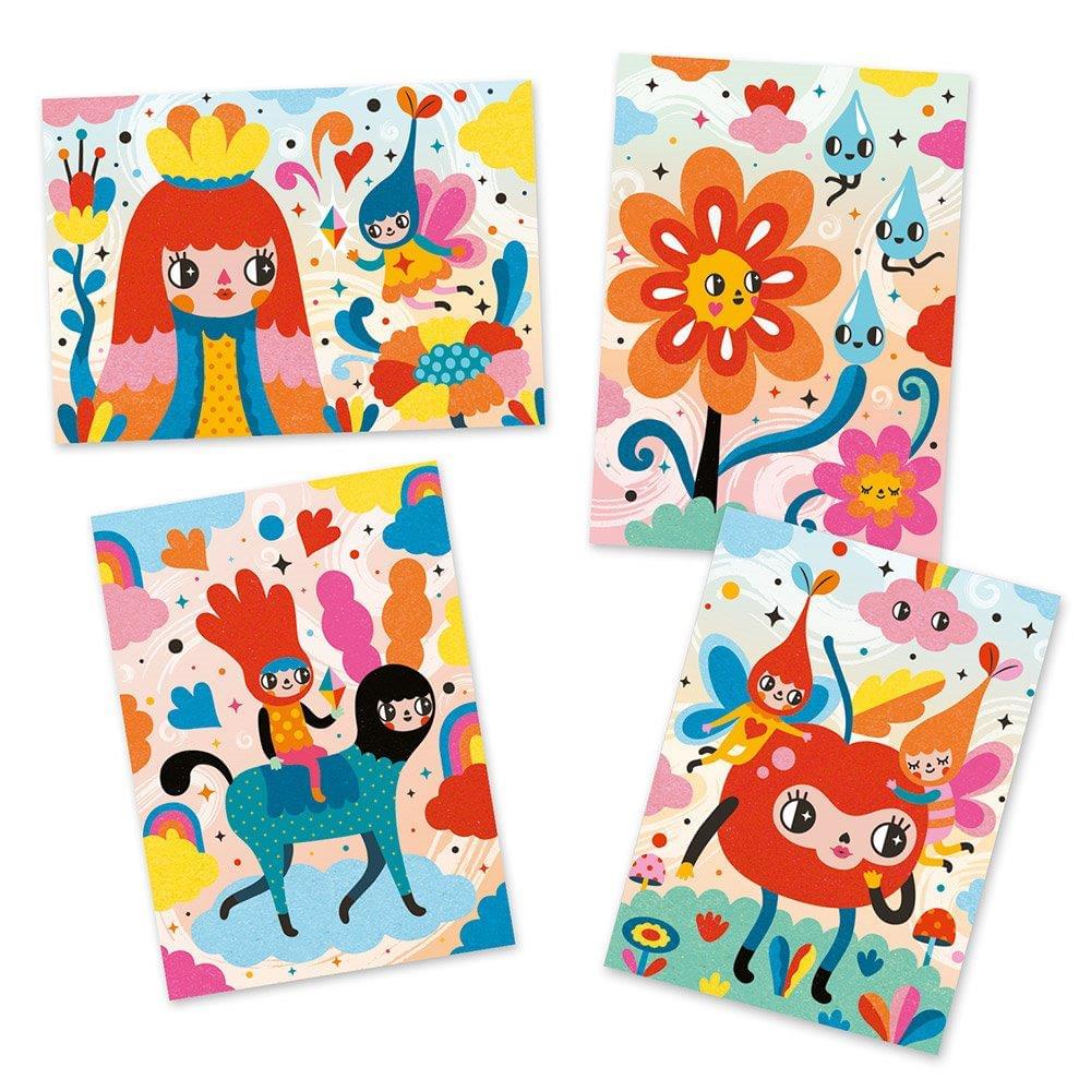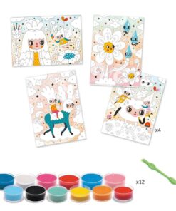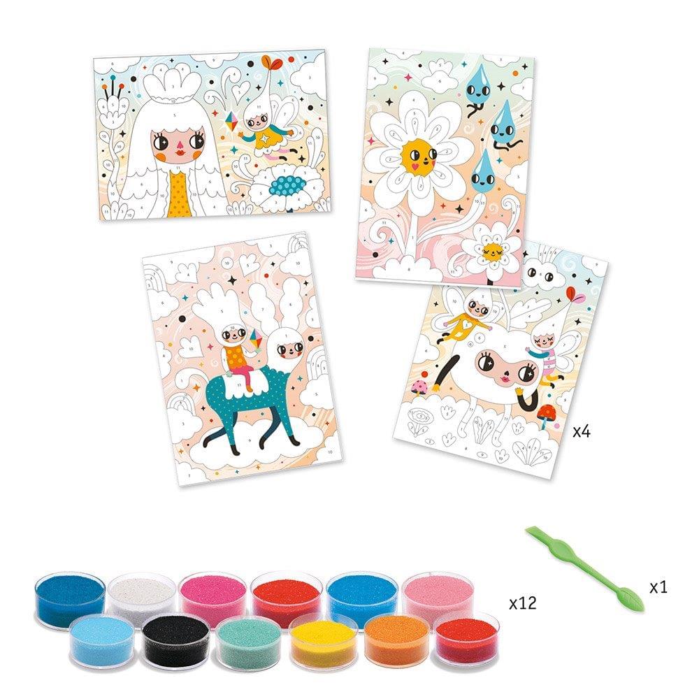 Ανακαλύψτε τον μαγικό κόσμο των ξωτικών με την εικαστική σειρά της εταιρίας Djeco! Σε αυτό το σετ χειροτεχνίας δημιουργούμε παράξενα ξωτικά με άμμο. Χρησιμοποιώντας το ειδικό εργαλείο αφαιρούμε τα άσπρα αυτοκόλλητα και στη θέση τους ρίχνουμε την χρωματιστή άμμο.