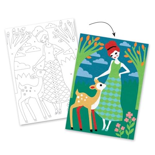 Χειροτεχνία από τη Γαλλική εταιρεία Djeco. Μία μοναδική εικαστική τεχνική με χρωματιστή άμμο. Αφαιρέστε το κατάλληλο αυτοκόλλητο με το ειδικό εργαλείο και τοποθετήστε πάνω το αντίστοιχο χρώμα άμμου. Το υπόλοιπο που δεν θα κολληθεί μπορείτε να το αδειάστε από την ειδική τρυπούλα που βρίσκεται στην άκρη του κουτιού στο βαζάκι του.
