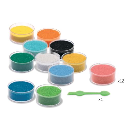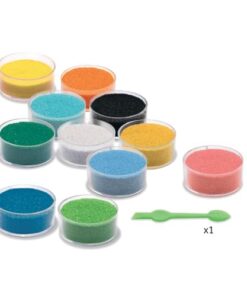 Περιέχει 12 βαζάκια με χρωματιστή άμμο, 4 σχέδια, 1 εξάρτημα για την αφαίρεση των αυτοκόλλητων και ένα έγχρωμο βιβλίο με οδηγίες βήμα προς βήμα.