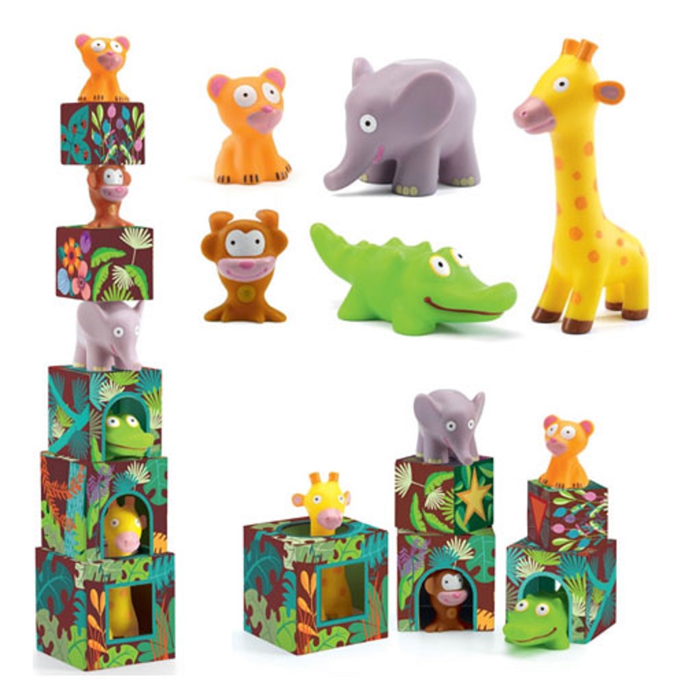 Οι κύβοι είναι ανοικτοί στο μπροστινό μέρος τους, ώστε να μπορούν να χρησιμοποιηθούν σαν μικρά σπίτια, για τα 5 πλαστικά ζωάκια που περιλαμβάνονται στην συσκευασία (καμηλοπάρδαλη, κροκόδειλος, ελέφαντας, μαϊμού και λιοντάρι).