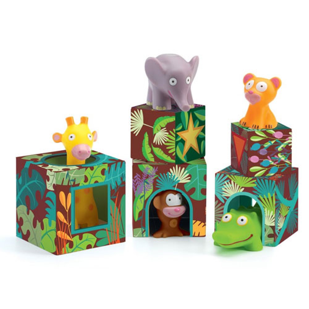 Περιλαμβάνει 5 κύβους, κατασκευασμένους από ενισχυμένο χαρτόνι και εικονογραφημένους με ελκυστικές εικόνες από την άγρια ζούγκλα.