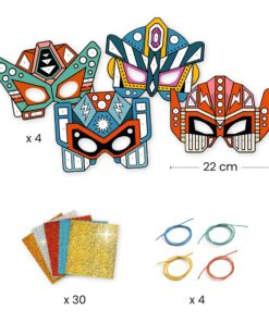Το παιχνίδι περιλαμβάνει 4 μάσκες (22 x 16 εκ.), 30 μεταλλιζέ φύλλα χρυσού, 4 λαστιχάκια και εικονογραφημένες οδηγίες.